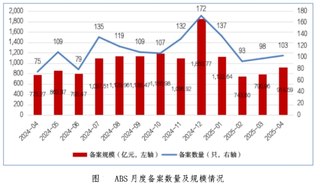 中国基金业协会最新发布的数据显示,2025年4月,资产支持专项计划(ABS)新增备案103只,新增备案规模合计914.59亿元。