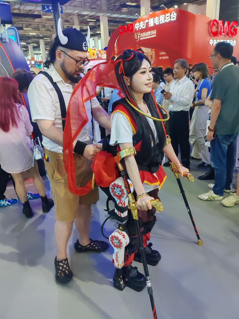 项戴乾坤圈,身披混天绫,30日上午,在第21届中国国际动漫节的展览现场,一位下肢瘫痪的COSER(动漫角色扮演者)向公众展现了哪吒的形象。让她站立行走的不是风火轮,而是外骨骼机器人。