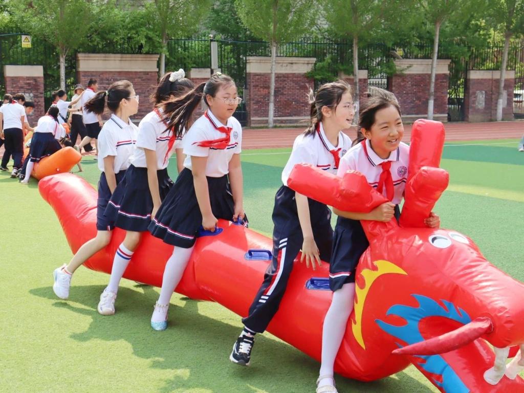 “我们准备了四条‘充气’龙舟,每条可供四五名学生参与,分年级轮流体验。”学校宣传中心主任兰凯琪介绍,活动覆盖一至七年级,分时段进行,“北方孩子接触水上龙舟机会有限,旱地形式既保障安全,更是一次身临其境的传统文化体验,有效增进了学生对非遗的理解与认同。”