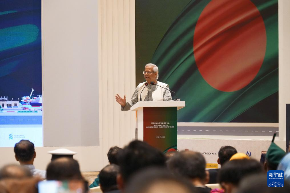 6月1日,在孟加拉国达卡举行的中国-孟加拉国贸易投资大会上,孟加拉国临时政府首席顾问尤努斯致辞。新华社记者 孙楠 摄