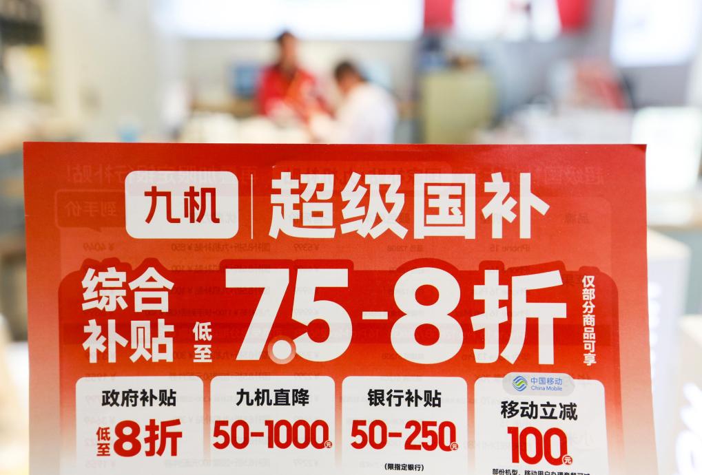 4月16日在云南省红河哈尼族彝族自治州蒙自市一手机店拍摄的手机补贴政策宣传海报。新华社发(薛莹莹 摄)