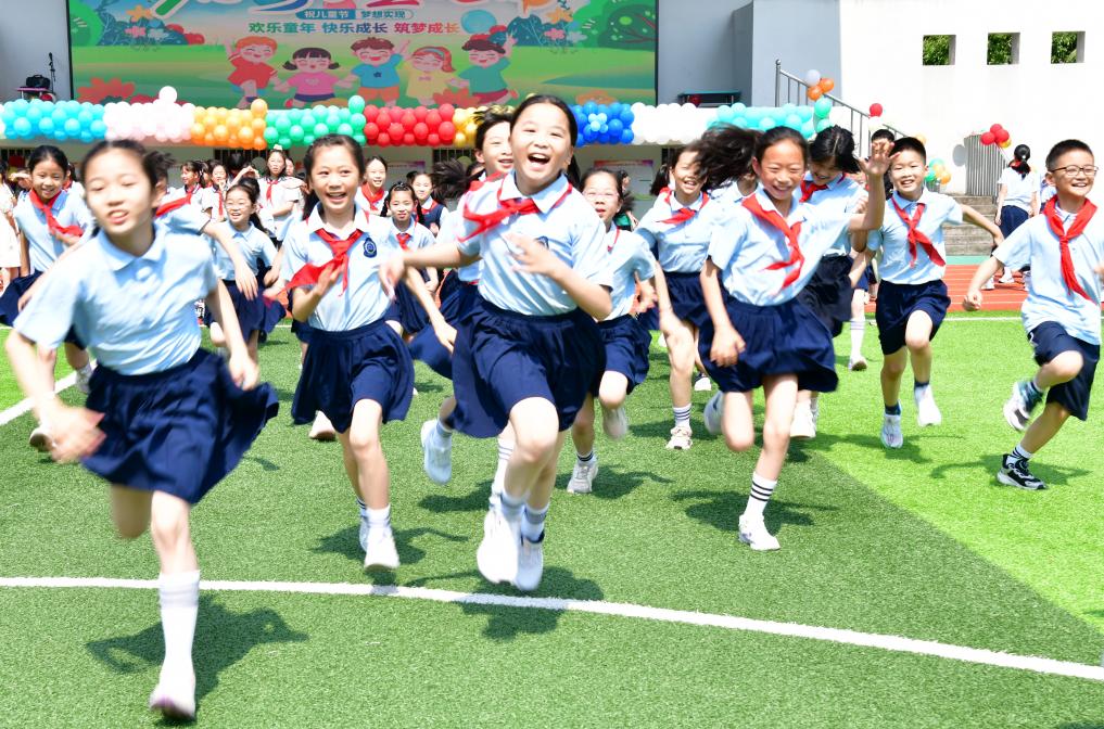 “六一”国际儿童节,各地孩子们花样迎接自己的节日。5月30日,浙江省建德市明珠小学的小学生在操场上欢庆奔跑。 新华社发(宁文武摄)