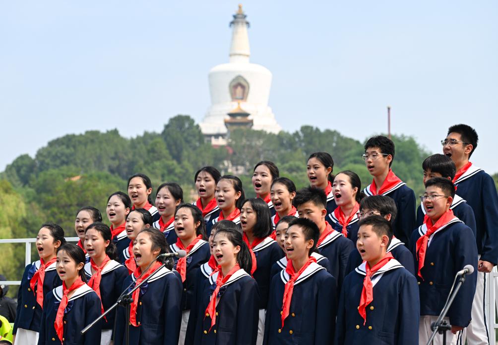 5月29日,来自北京市10支少年合唱团的少先队员们在白塔下放歌,庆祝即将到来的儿童节。新华社记者 陈钟昊 摄