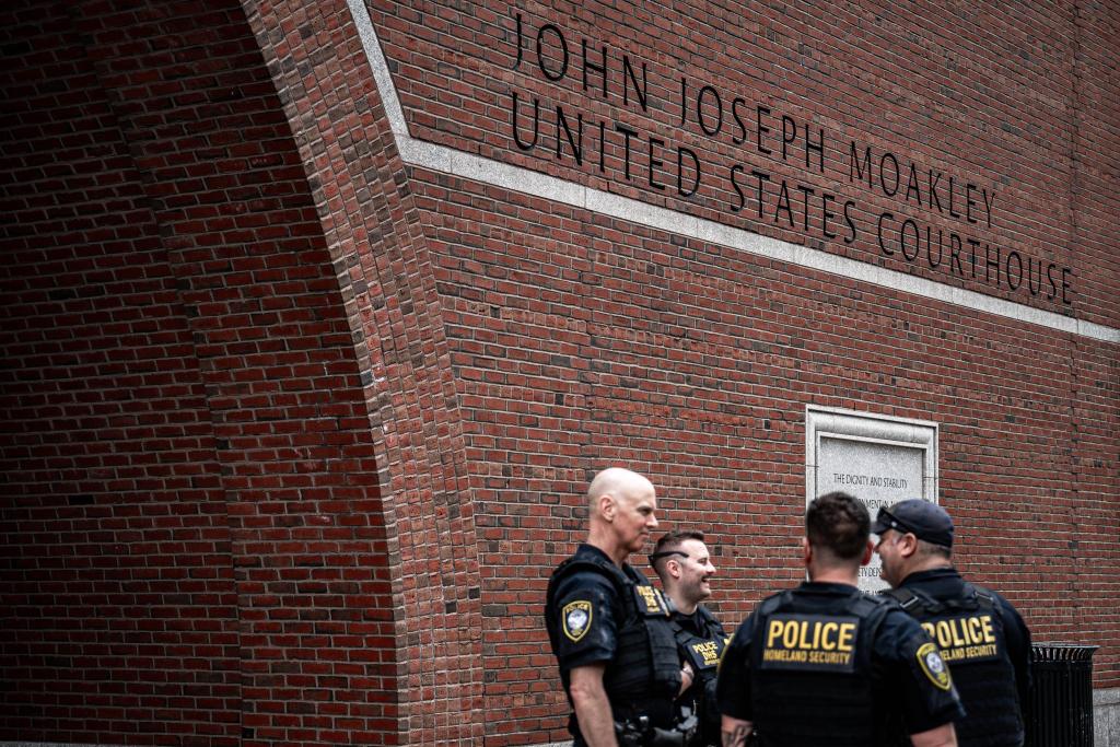 2025年5月29日,在美国马萨诸塞州波士顿,警察站在马萨诸塞州联邦地区法院外。美国马萨诸塞州联邦地区法院一名法官29日批准了哈佛大学对法院提出的发布初步禁令请求,“叫停”特朗普政府取消哈佛大学招收外国学生资质的政策。新华社发(朱子于摄)