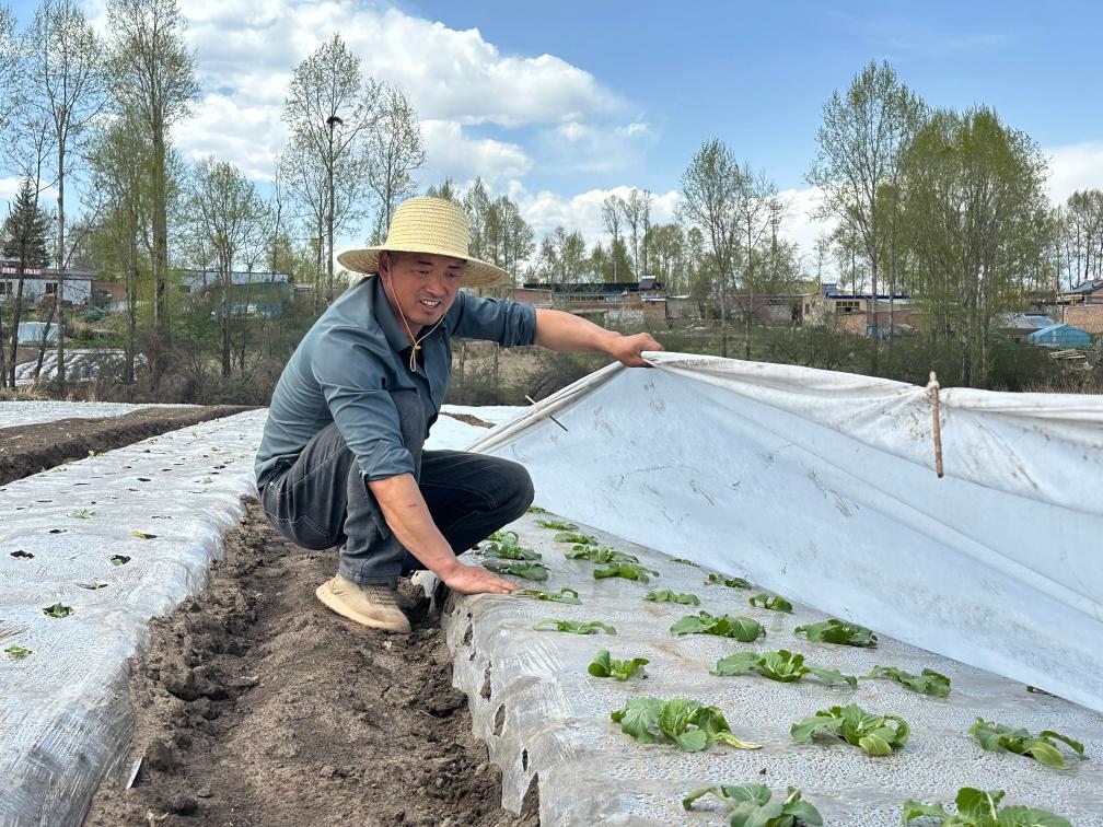 在西宁市湟中区西堡镇东花园村,钟光言在菜地查看蔬菜长势。新华社记者张子琪 摄