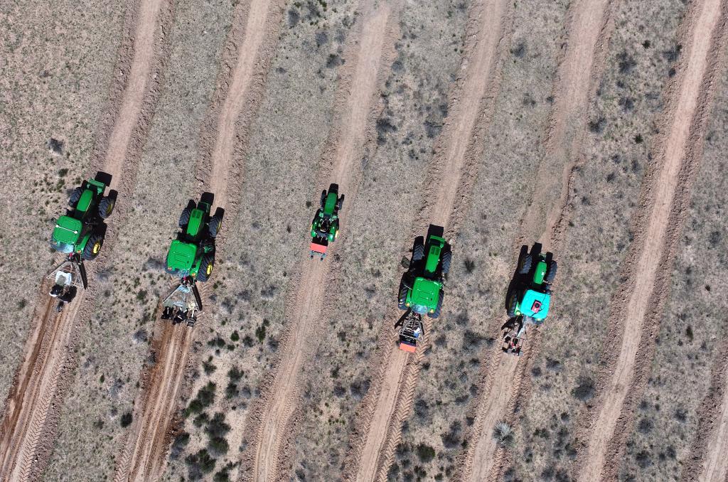 牵引播种机在内蒙古鄂尔多斯市杭锦旗防沙治沙项目区种柠条。新华社记者李云平 摄