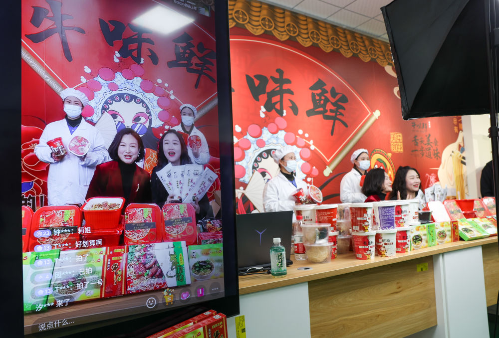 襄阳市樊城区一食品产业园的主播正在直播带货襄阳牛肉面。
