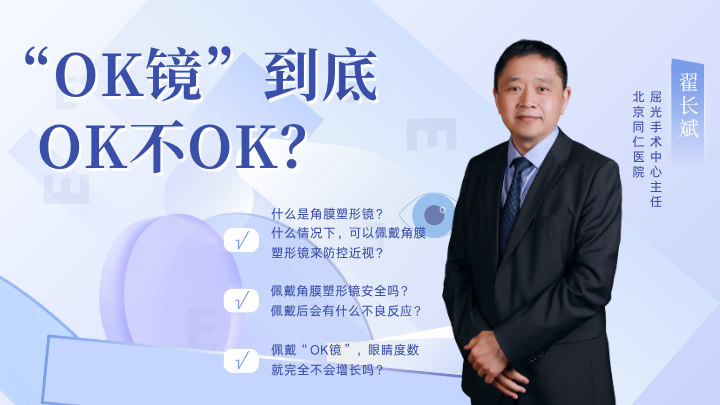 近年来,青少年近视防控成为热点问题,角膜塑形镜(“OK镜”)成为摘镜新途径。佩戴角膜塑形镜安全吗?佩戴后会有什么不良反应?佩戴“OK镜”,眼睛度数就完全不会增长吗?本期特邀北京同仁医院屈光手术中心翟长斌主任,深度解析角膜塑形镜(“OK镜”)的原理、适用人群、安全性及适配评估方法,为家长和青少年提供权威指导。