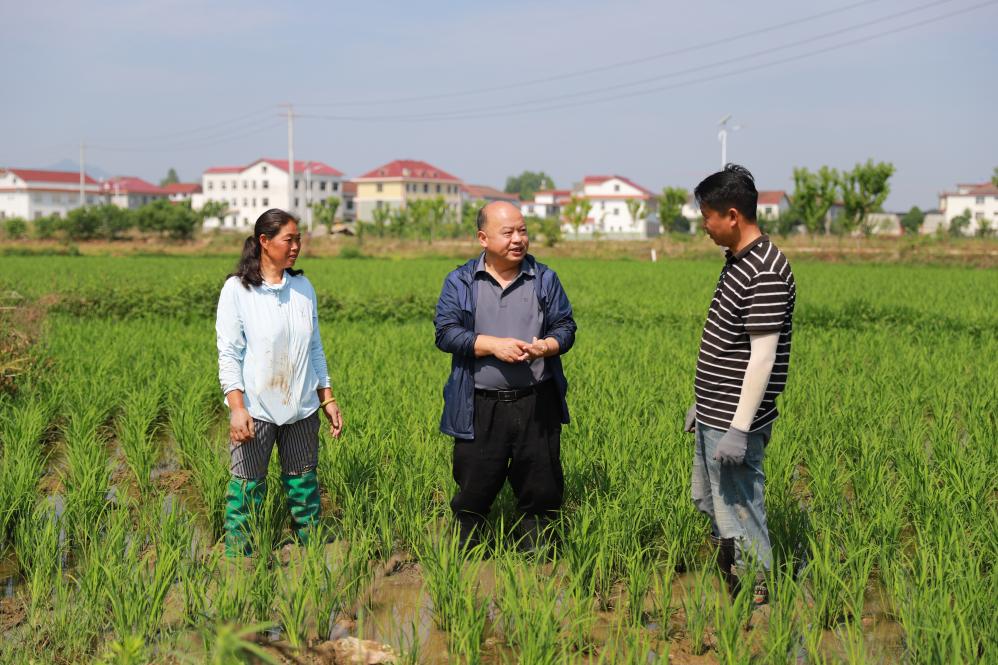 草堰村村民来万龙按照张万春的指导,在自家水田进行着人工插秧。趁着歇脚的功夫,他说:“有了老张手把手的指导,我家水田不仅秧苗扎根稳,株距也保持在了合理范围。”