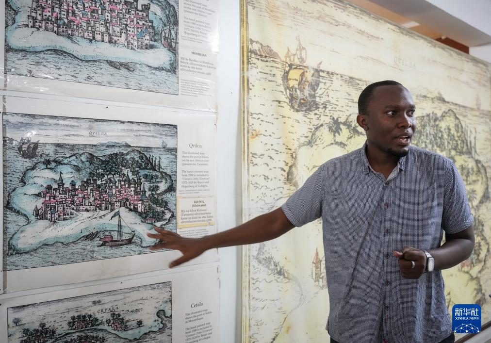 4月22日,在坦桑尼亚达累斯萨拉姆,坦桑尼亚国家博物馆历史分馆馆长肖马里·拉贾布·肖马里介绍基卢瓦基西瓦尼遗址历史背景。新华社记者 李亚辉 摄