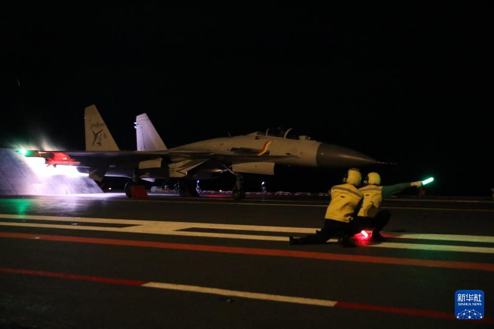 6月上旬,海军航母编队在西太平洋海域开展训练。图为舰载战斗机进行夜间起飞。新华社发(王健 摄)