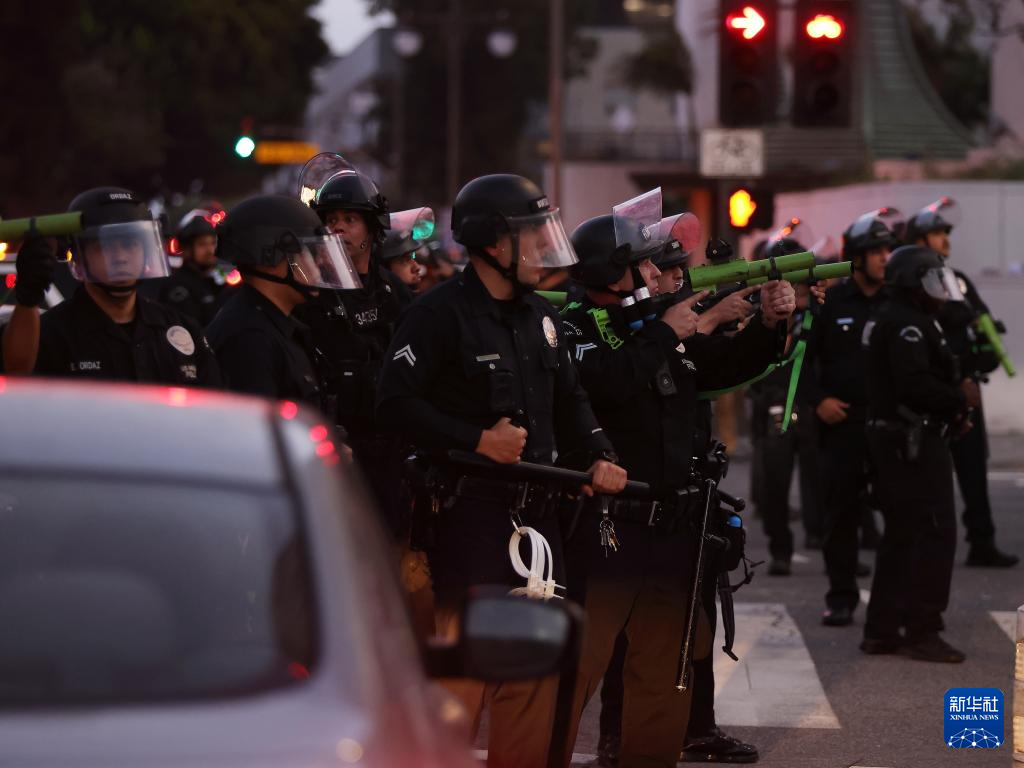 6月10日,在美国加利福尼亚州洛杉矶市中心,警察在宵禁生效后试图驱散街上的人群。新华社发(邱晨摄)