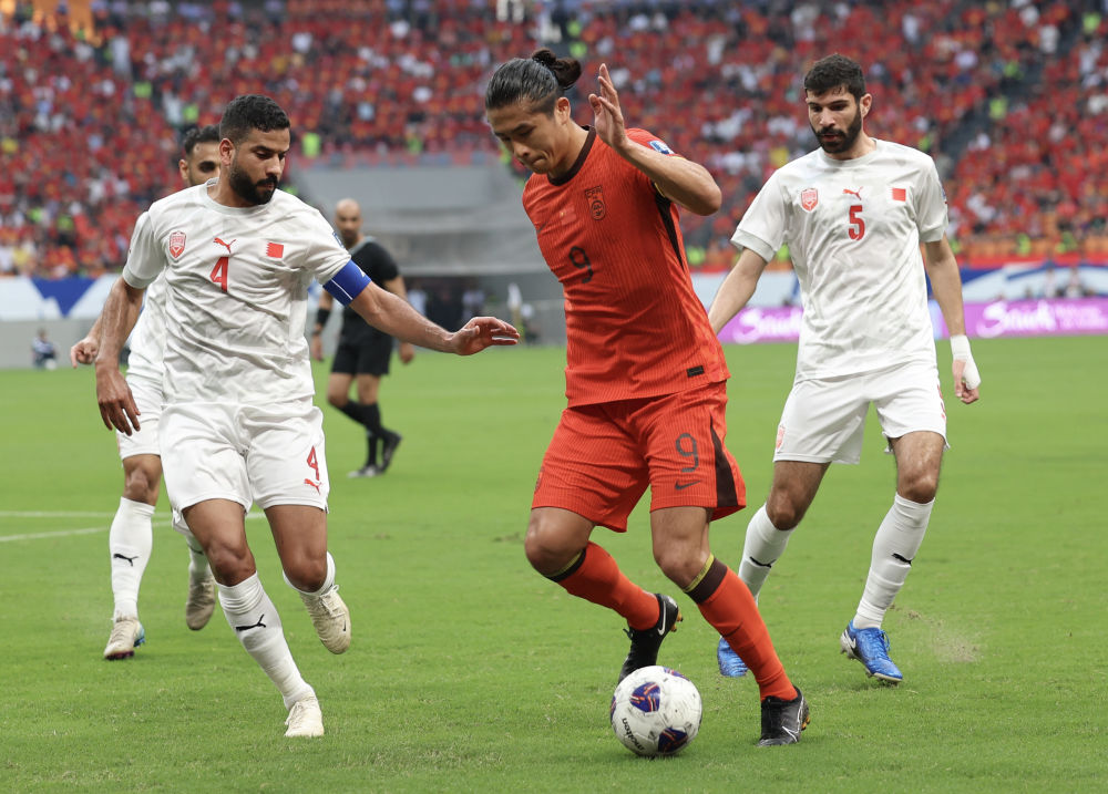 6月10日,刘诚宇(左)在比赛中防守巴林队球员阿明·本阿迪。新华社记者 胡星宇 摄