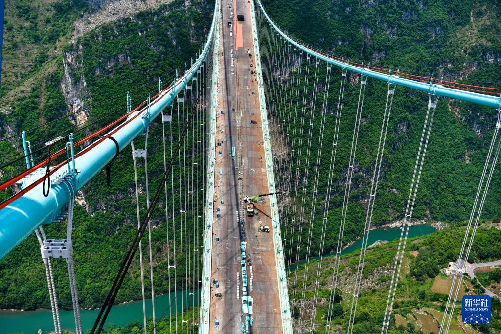 新华社贵阳6月12日电(记者向定杰)12日,随着最后一根承重绳下放到位,贵州花江峡谷大桥的猫道拆除完毕,标志着这座在建世界最高桥又完成一个重要施工节点,为9月底具备通车条件奠定坚实基础。