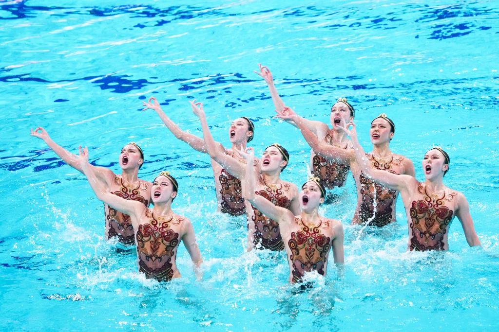 集体技术自选比赛中,多位巴黎奥运会冠军坐镇的中国队以国产游戏《黑神话:悟空》为主题,将赛场氛围带入高潮。姑娘们头戴“金箍”化身“天命人”,斩获全场最高的277.2258分,西班牙队和日本队分获银牌和铜牌。中国队选手常昊说:“戴‘金箍’对做转体动作会有一些影响,但我们能克服。我们请了专业的编导老师来帮我们编排,对今天的表现我觉得可以打8分。”