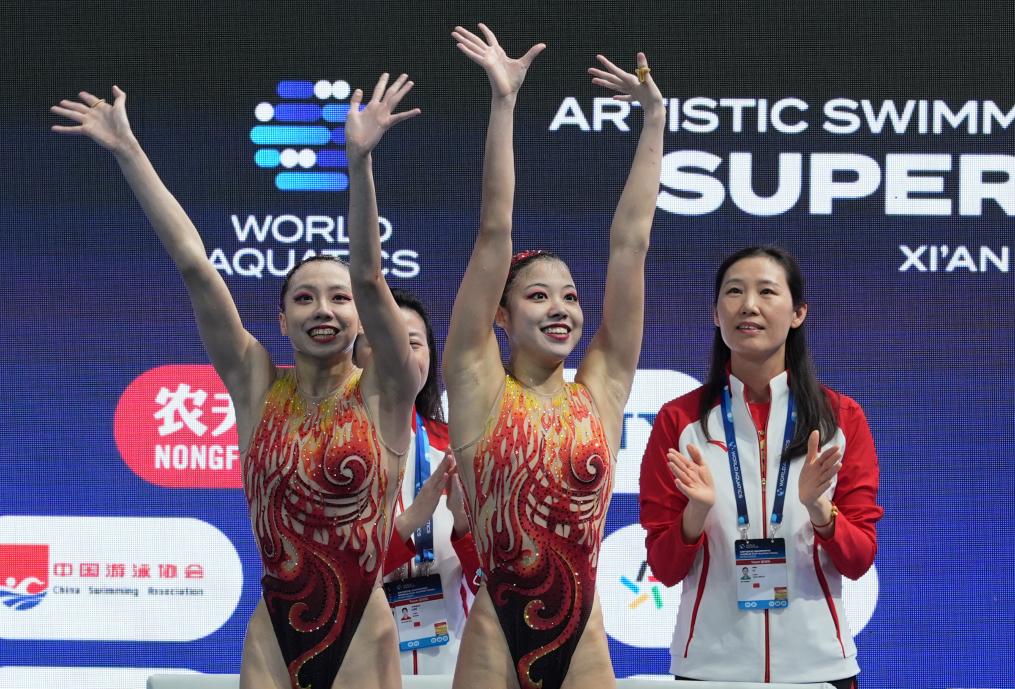 新华社西安6月13日电(记者姚友明、李嘉)13日,2025年世界泳联花样游泳世界杯总决赛在西安奥体中心跳水游泳馆拉开战幕。中国队在女子单人技术自选、女子双人技术自选和集体技术自选比赛中,将必做动作与“中国风”巧妙融合,拼下三枚金牌。