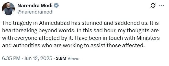 印度总理莫迪12日在社交媒体上写道:“艾哈迈达巴德的悲剧令人震惊和悲痛。这令人心碎,难以言表。”