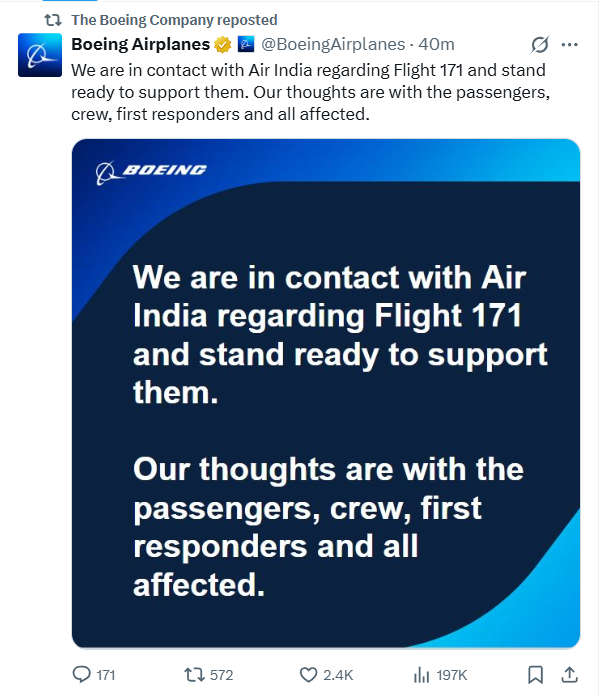 波音公司12日在社交媒体发文说:“我们正就171航班事宜与印度航空保持联系,并随时准备提供支持。我们的心与乘客、机组人员、急救人员以及所有受影响人员同在。”