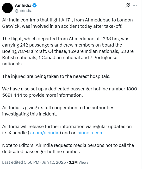 印度航空公司12日证实,坠毁客机载有242名乘客和机组人员,其中包括169名印度公民、53名英国公民、1名加拿大公民和7名葡萄牙公民。