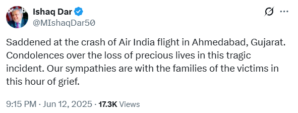 巴基斯坦副总理兼外长达尔12日在社交媒体上写道:“我们对印度航空客机在古吉拉特邦艾哈迈达巴德坠毁事件深感悲痛。我们对此次悲剧事件中宝贵生命的逝去深表哀悼。值此悲痛时刻,我们向遇难者家属致以诚挚慰问。”