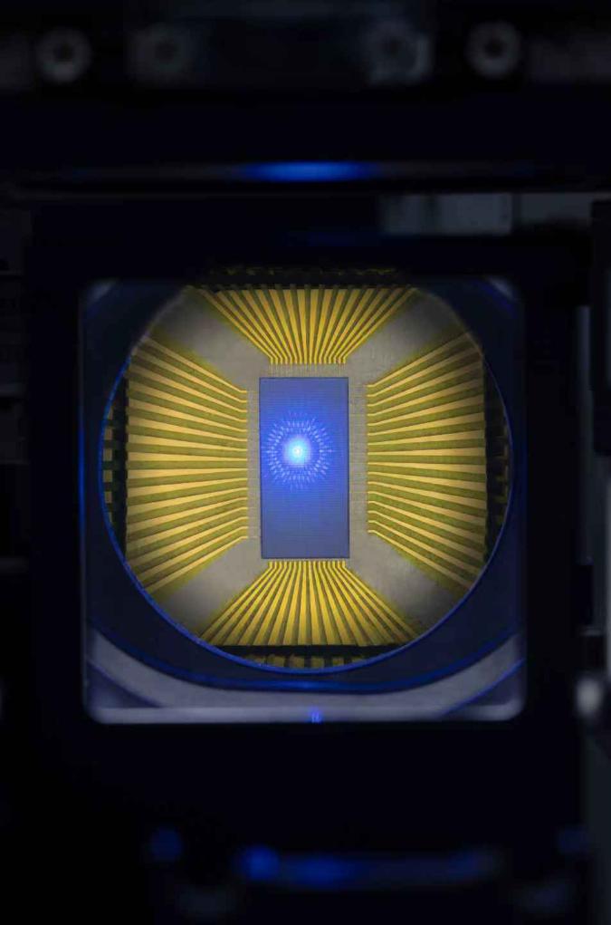 图为柔性探针接触LED晶圆后,点亮其中的一个LED发出蓝色光。(受访者供图)
