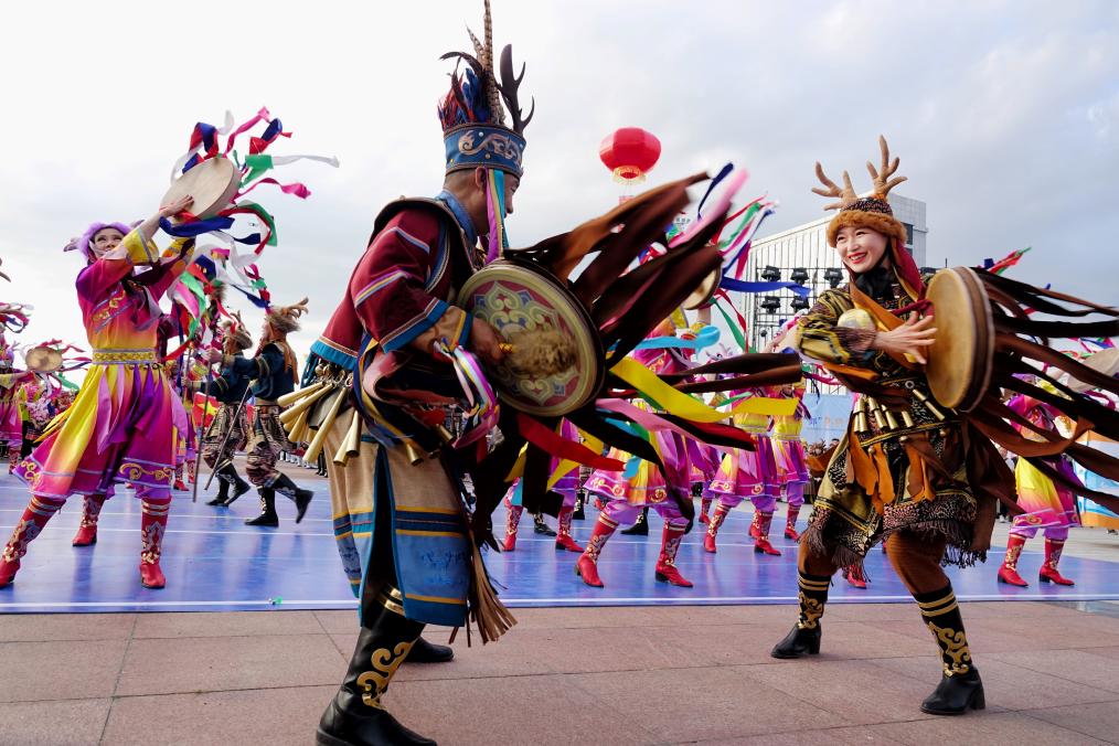 在赫哲族第十二届乌日贡大会现场,赫哲族群众进行民俗文艺表演。新华社发(刘万平摄)