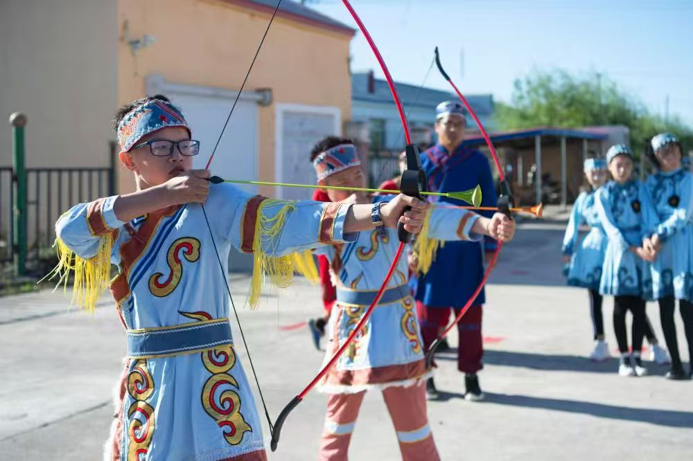 抚远市乌苏镇赫哲族学校里,孩子们正在体验射箭。(受访者供图)