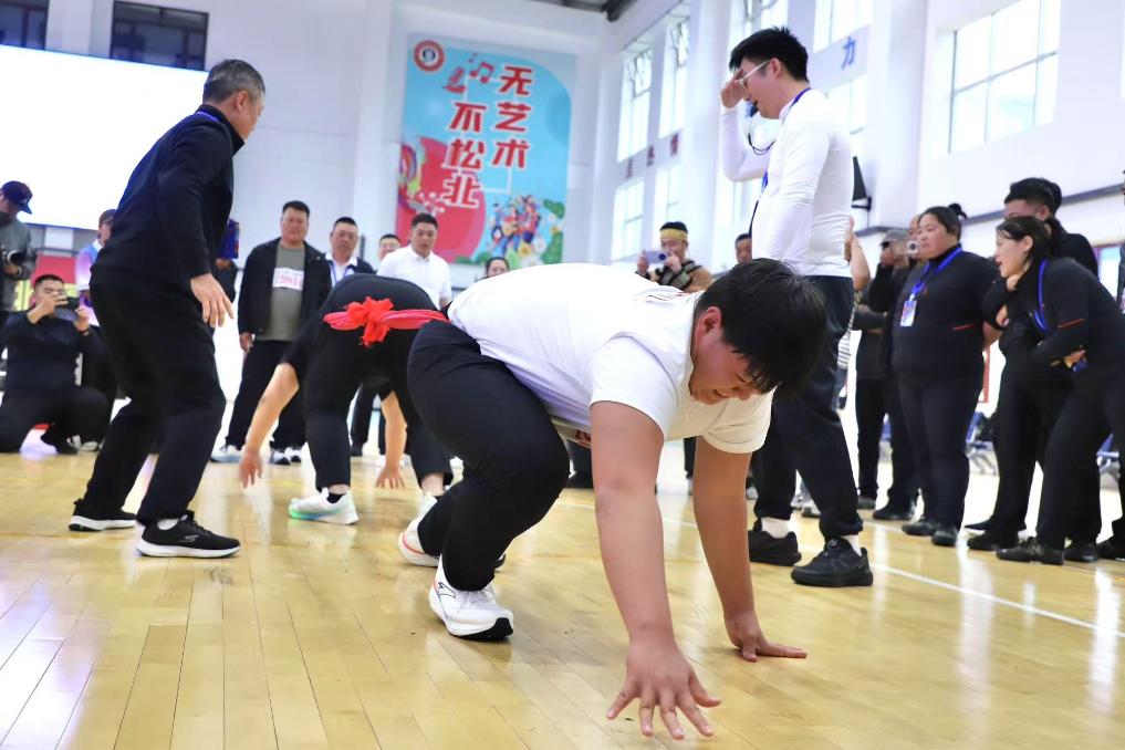 在赫哲族第十二届乌日贡大会现场,赫哲族选手参加鱼王角力项目比赛。新华社记者徐凯鑫摄