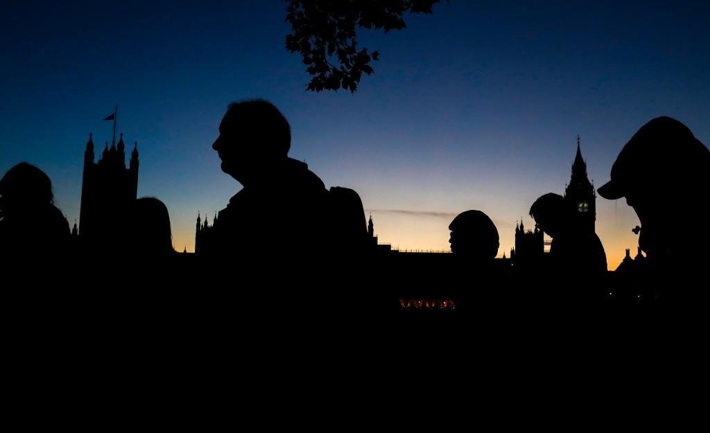 2022年9月17日,在英国伦敦,人们在威斯敏斯特宫对岸排队,等待进入威斯敏斯特宫瞻仰女王灵柩。