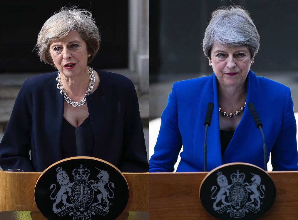 (左图)2016年7月13日,新首相特雷莎·梅在首相府发表演讲。(右图)2019年7月24日,特雷莎·梅发表告别演说。她随后与丈夫离开唐宁街10号首相府,去向英国女王请辞。