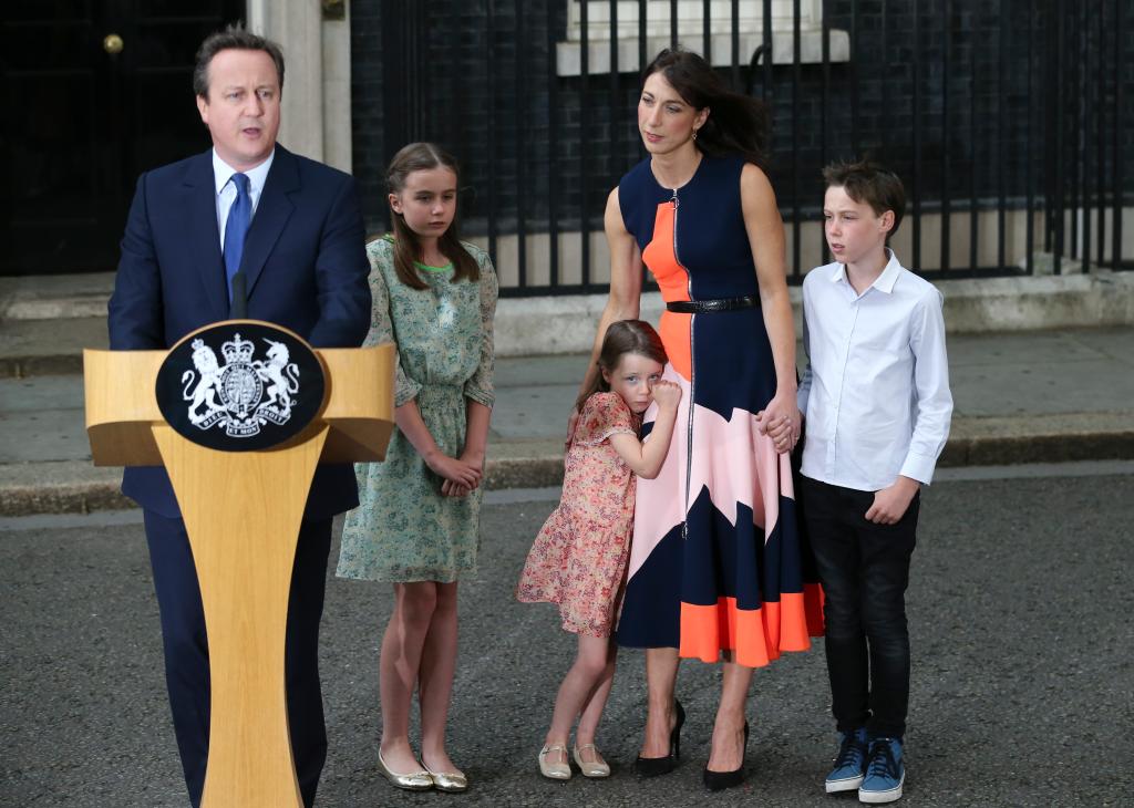 2016年7月13日,英国离任首相卡梅伦(左一)离开首相府前讲话。