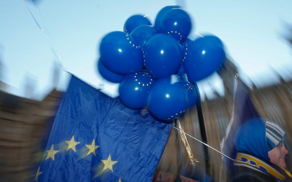 2019年3月12日,支持留欧的人们持欧盟旗帜和气球在议会大厦外。