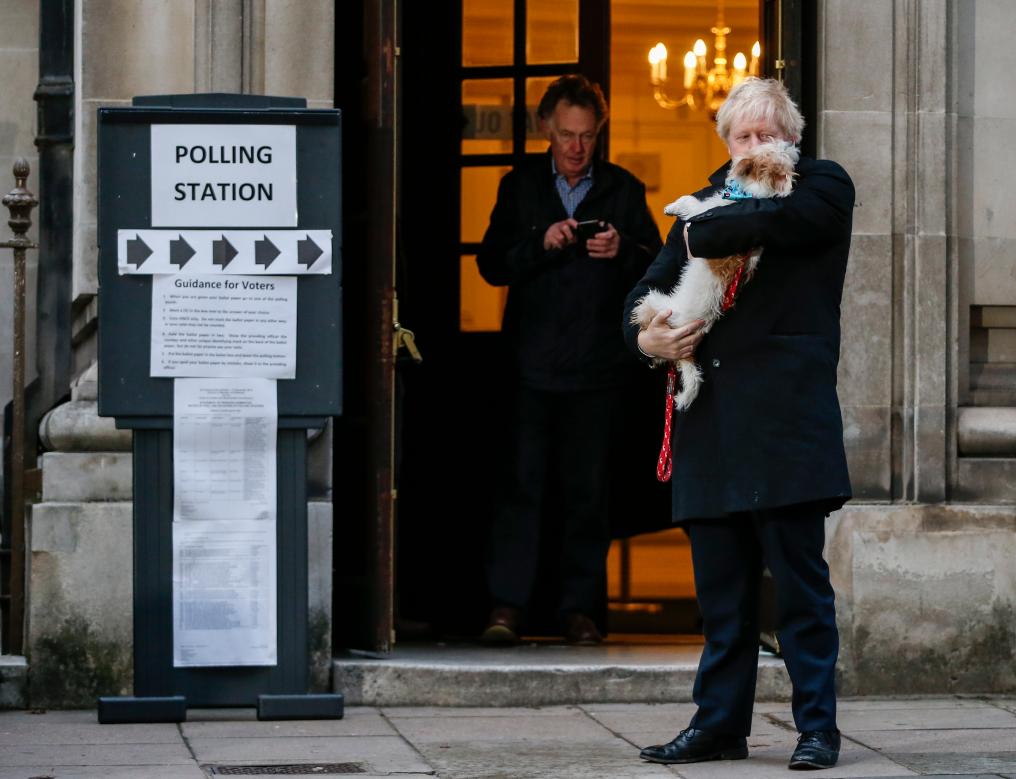 2019年12月12日,约翰逊在一个投票站投票后抱着他的小狗离开。