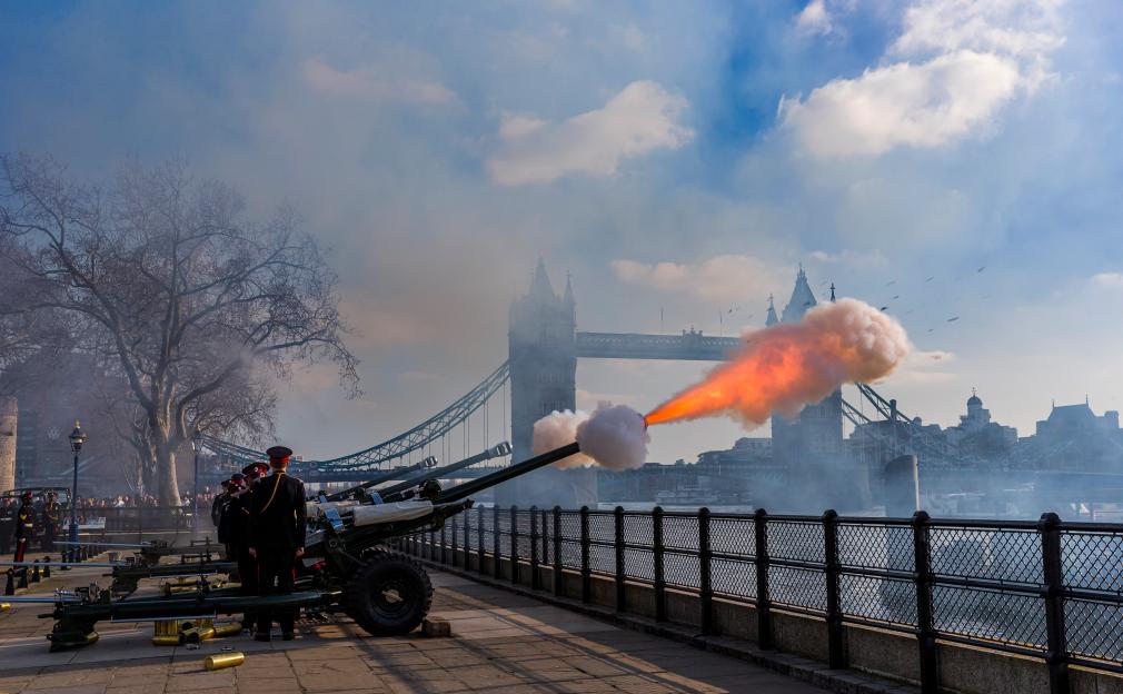 2020年2月6日,荣誉炮兵连在伦敦塔前鸣放礼炮,庆祝英女王登基68周年。