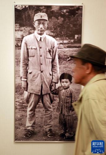 2008年4月12日,在日本东京举行的中国摄影家沙飞战地摄影展上,一名男子在欣赏沙飞拍摄的聂荣臻元帅和日本孤儿美穗子的照片。新华社记者任正来摄