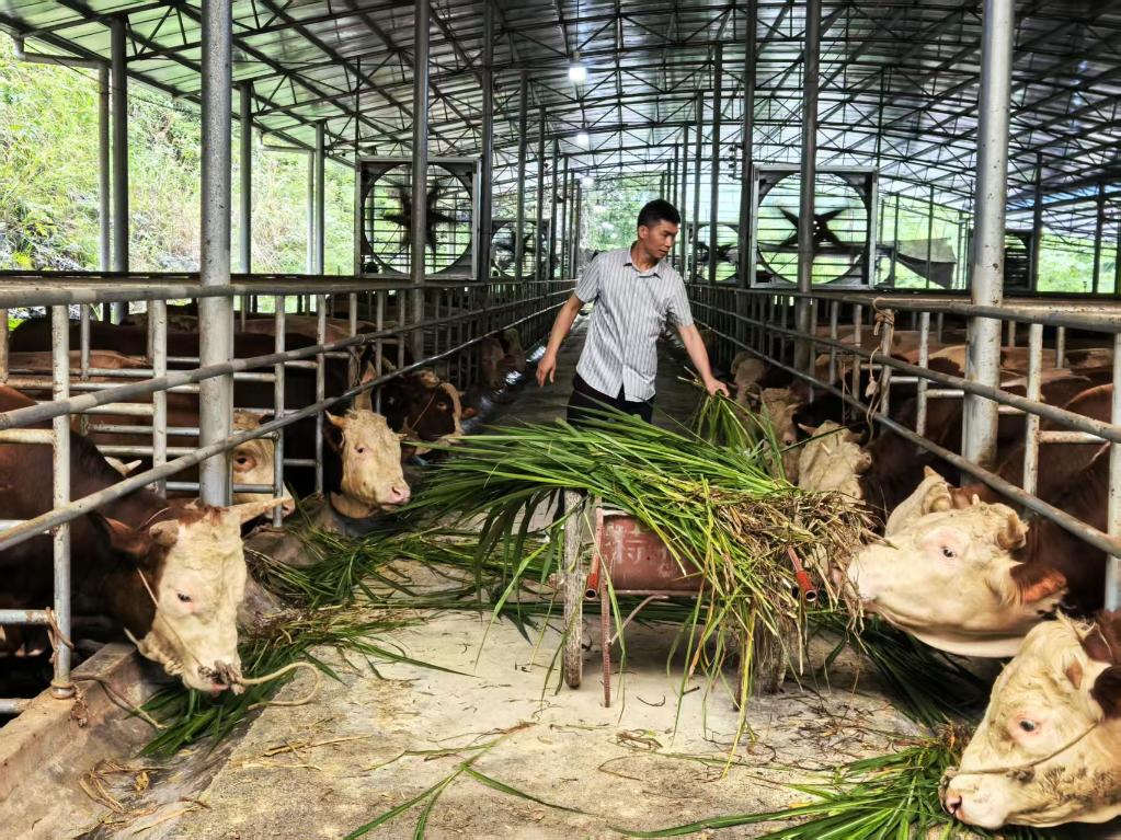 养牛大户谭成语在种养基地内给肉牛喂食牧草。新华社记者王楚然 摄
