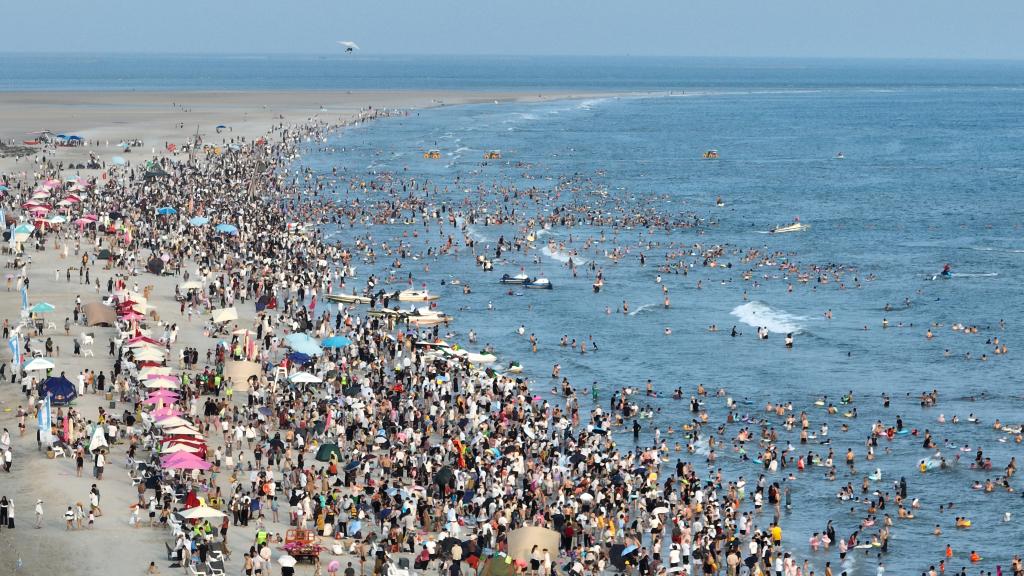 5月4日,游客在广西北海银滩国家旅游度假区戏水(无人机照片)。“五一”假期期间,各地推出丰富多彩的旅游产品供给,加强文旅融合和科技赋能,提升管理水平和服务品质,带动旅游消费欣欣向荣。新华社发(李君光 摄)