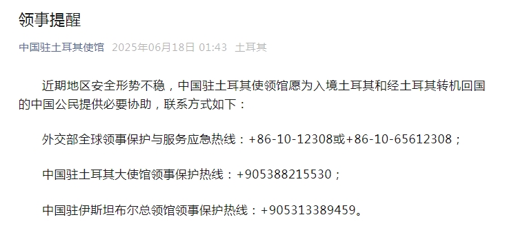 中国驻土耳其使馆6月18日发布领事提醒:近期地区安全形势不稳,中国驻土耳其使领馆愿为入境土耳其和经土耳其转机回国的中国公民提供必要协助,联系方式如下: