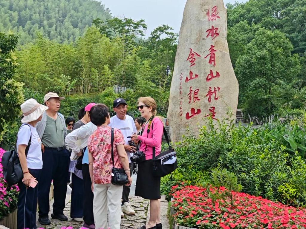在浙江省安吉县天荒坪镇余村,外媒记者采访游客。新华社记者 唐诗凝 摄