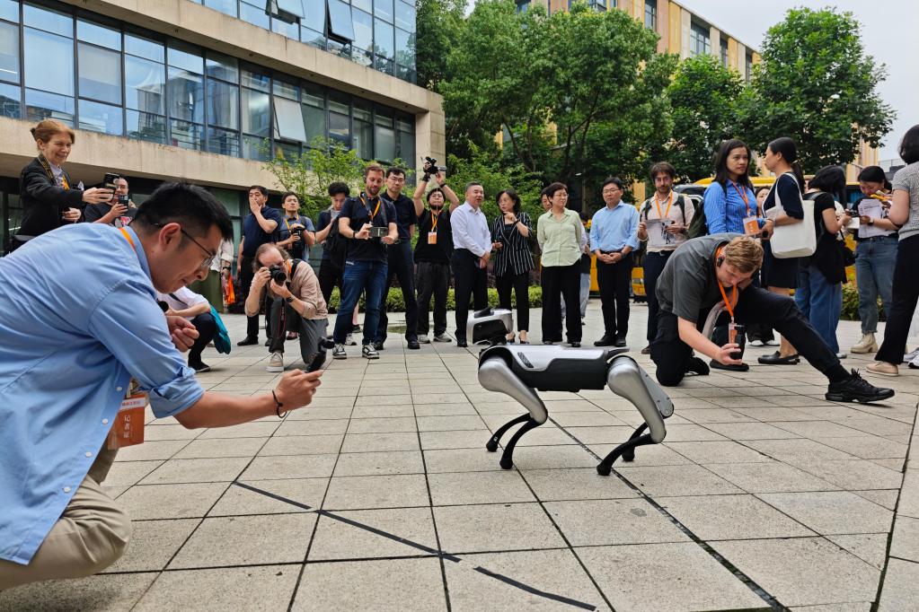 在魔法原子机器人科技(苏州)有限公司,中外媒体记者拍摄四足机器人。新华社记者 唐诗凝 摄