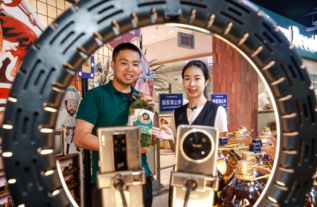 6月17日,主播在山东省青岛市李沧区深广互动直播基地内介绍家电产品“国补”政策。新华社发(张鹰摄)