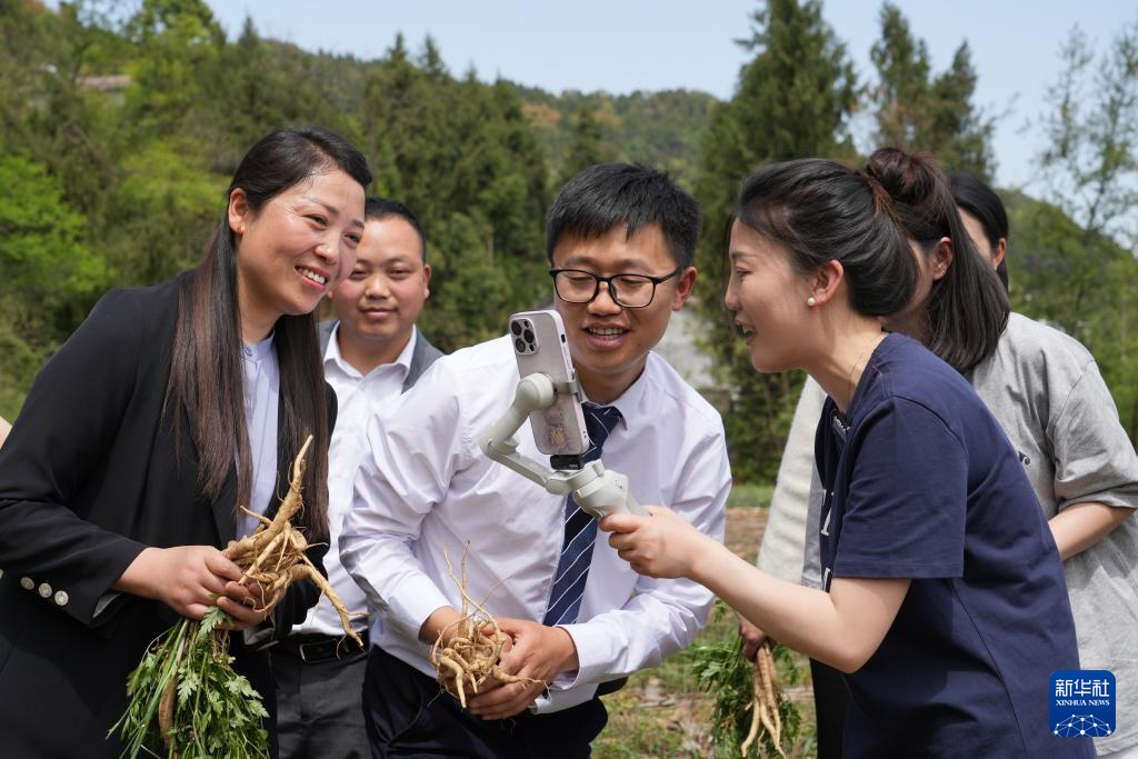 4月9日,“村播”们在四川省广元市苍溪县的沙参园直播。新华社发(王韬摄)