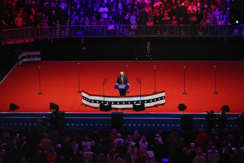 1月19日,即将于次日就任美国总统的特朗普在首都华盛顿特区第一资本体育馆举行的集会上讲话。新华社记者李睿摄