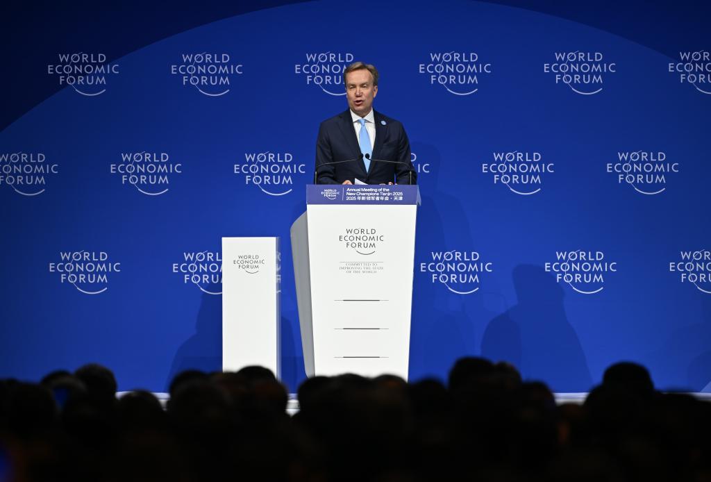 6月25日,在国家会展中心(天津),世界经济论坛总裁博尔格·布伦德在开幕式上发言。新华社记者 孙凡越 摄