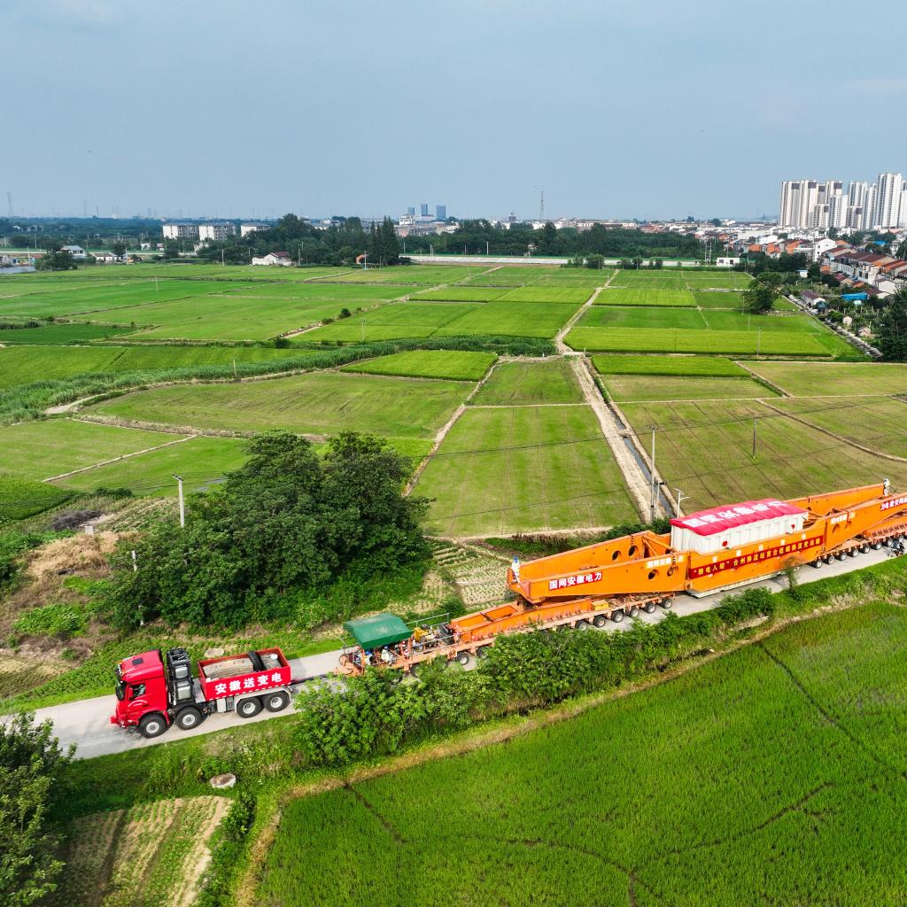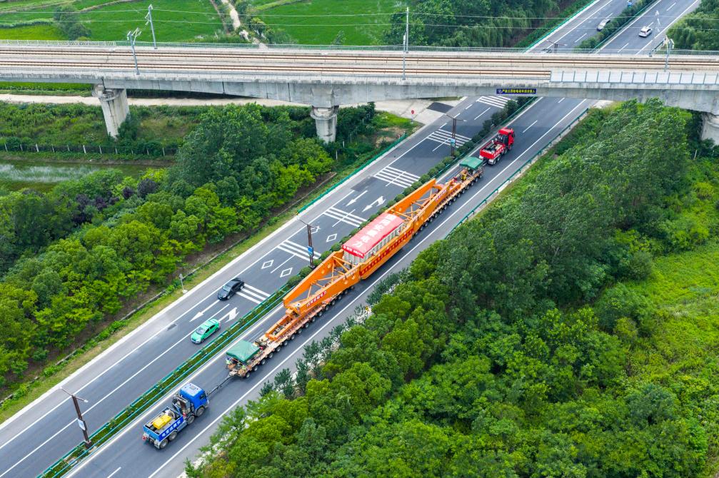 6月26日,±800千伏合州换流站低端换流变压器驶向合州换流站(无人机照片)。新华社发(郑贤列摄)