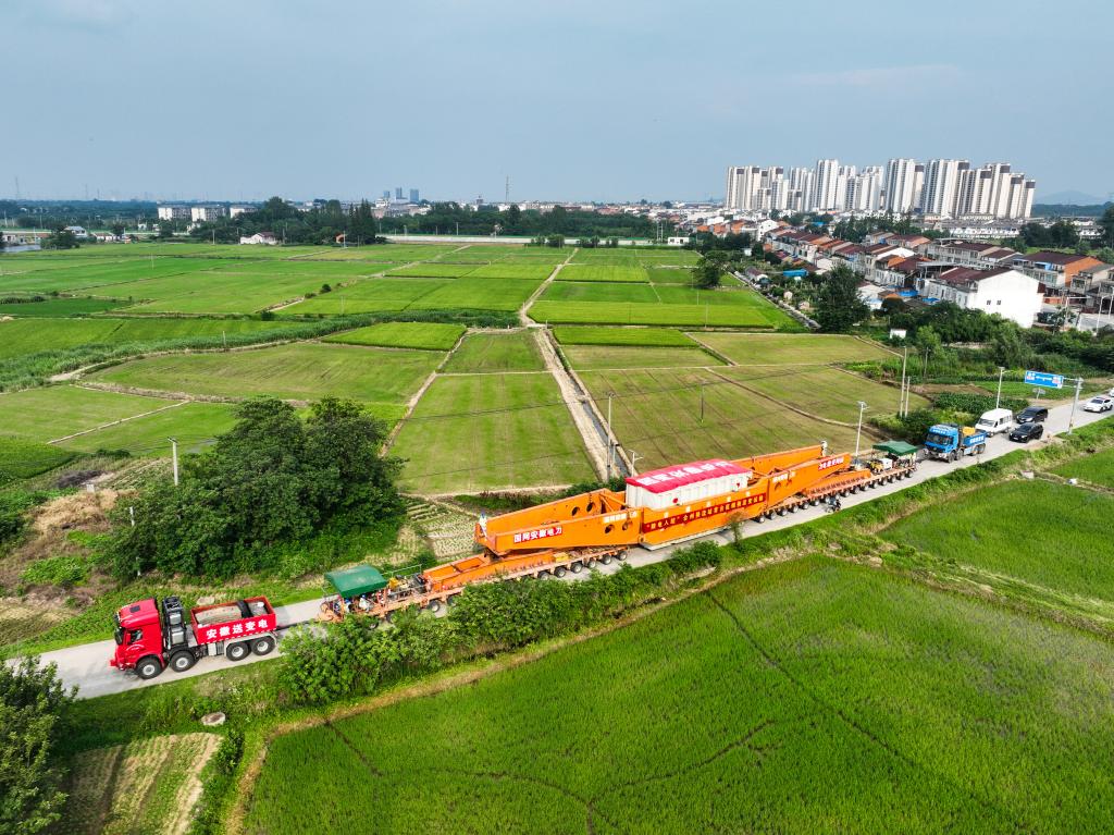6月26日,±800千伏合州换流站低端换流变压器驶向合州换流站(无人机照片)。新华社发(赵献富摄)