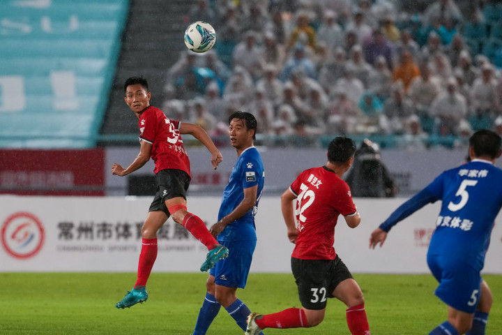 江苏各地市代表队的球员们,在“苏超”(2025江苏省城市足球联赛)上为球迷们送上一场场精彩对决。图为6月21日,常州队主场对阵南京队。新华社记者 李博 摄