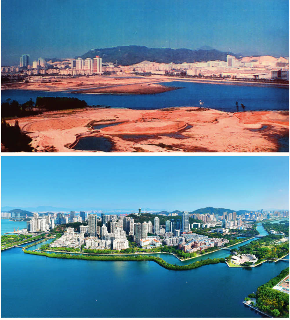 拼版照片:上图为20世纪80年代的厦门筼筜湖(资料照片);下图为厦门筼筜湖及周边城市景观(2024年1月24日摄 姜克红摄/本刊)