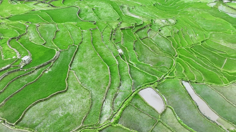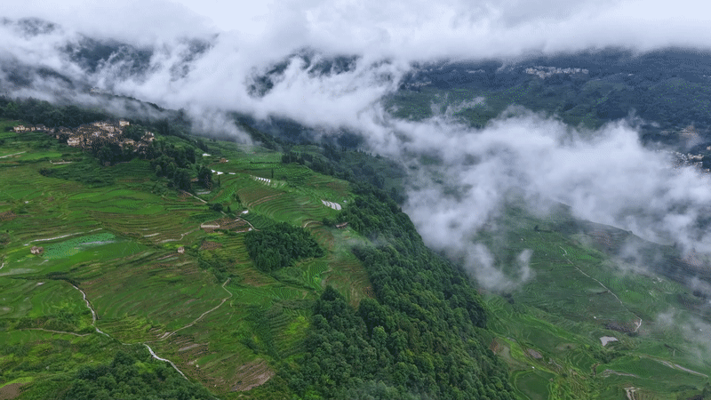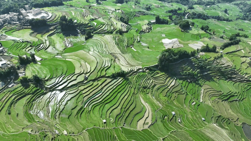 返青后的秧苗拔节生长,层层梯田壮美磅礴。清晨,薄雾如轻纱弥漫于梯田之上,梯田在流动的云雾中若隐若现。
