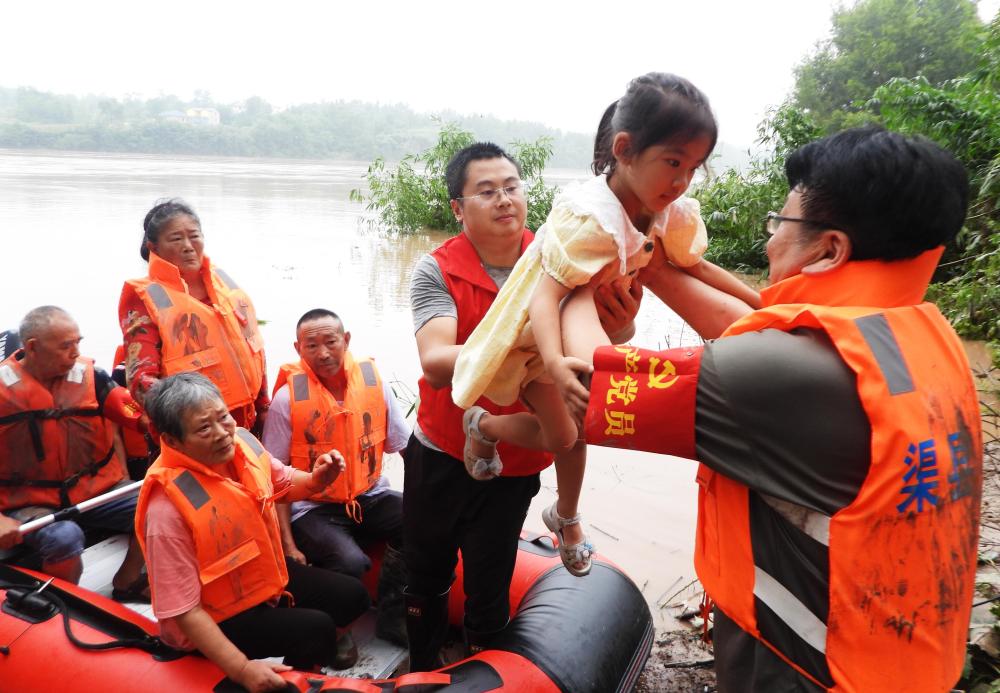 2024年7月12日,在四川省达州市渠县李渡镇灯台社区,党员干部志愿者在洪水中转移被困村民。新华社发(邓良奎 摄)